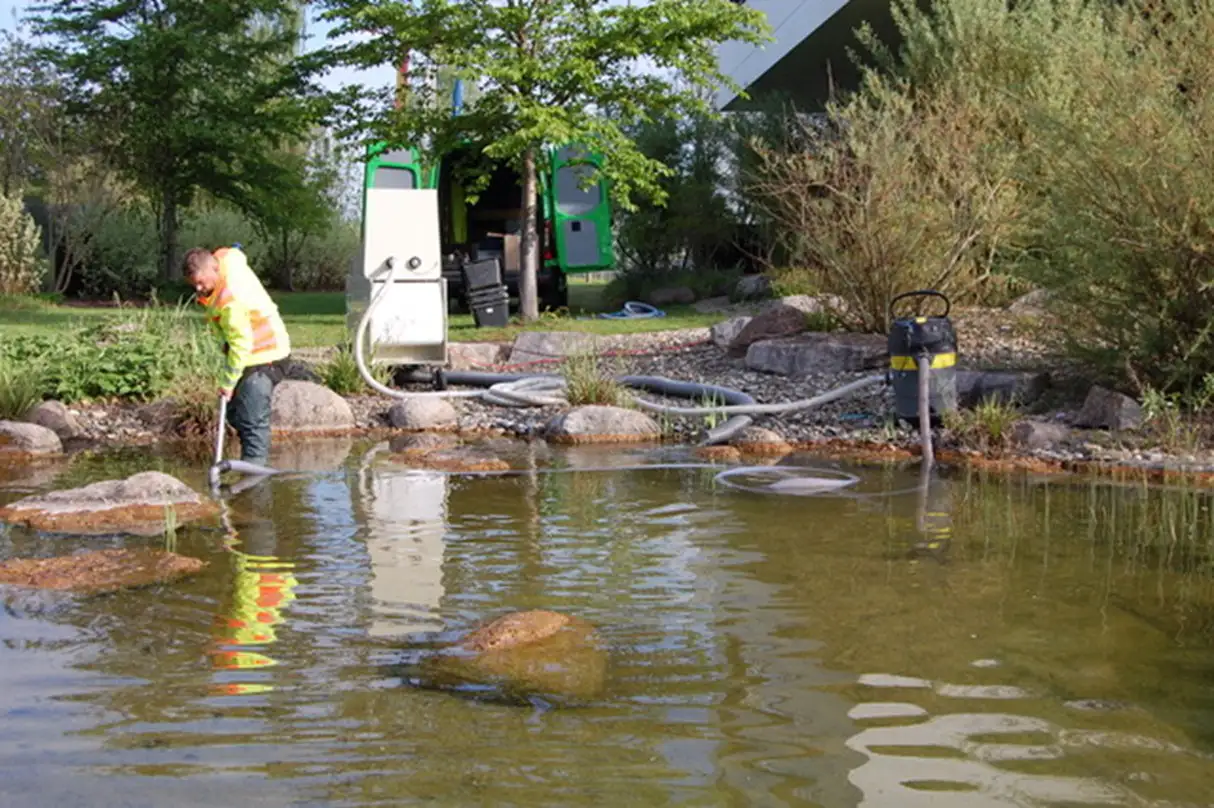 Mit unserer mobilen Aufbereitungsanlage reinigen wir Teiche und Biotope gründlich, ohne den Wasserspiegel vollständig absenken zu müssen.
